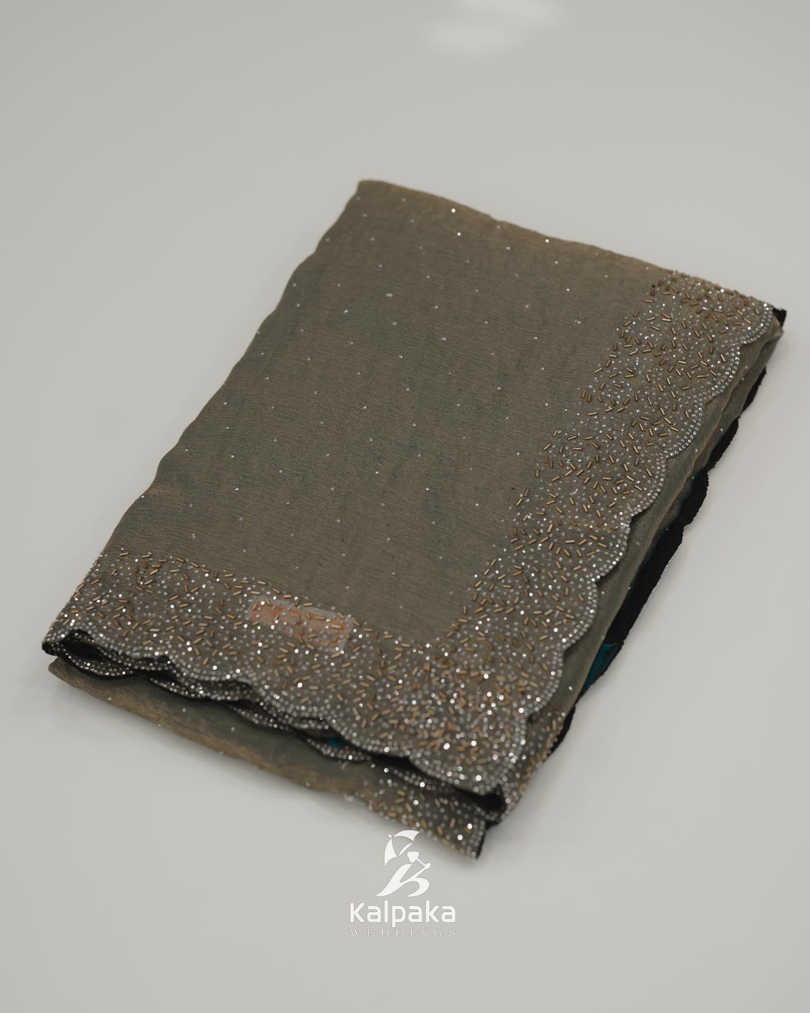 ⢠Design: A standout scalloped border adorned with intricate beadwork in gold and white, adding a touch of sparkle and luxury.