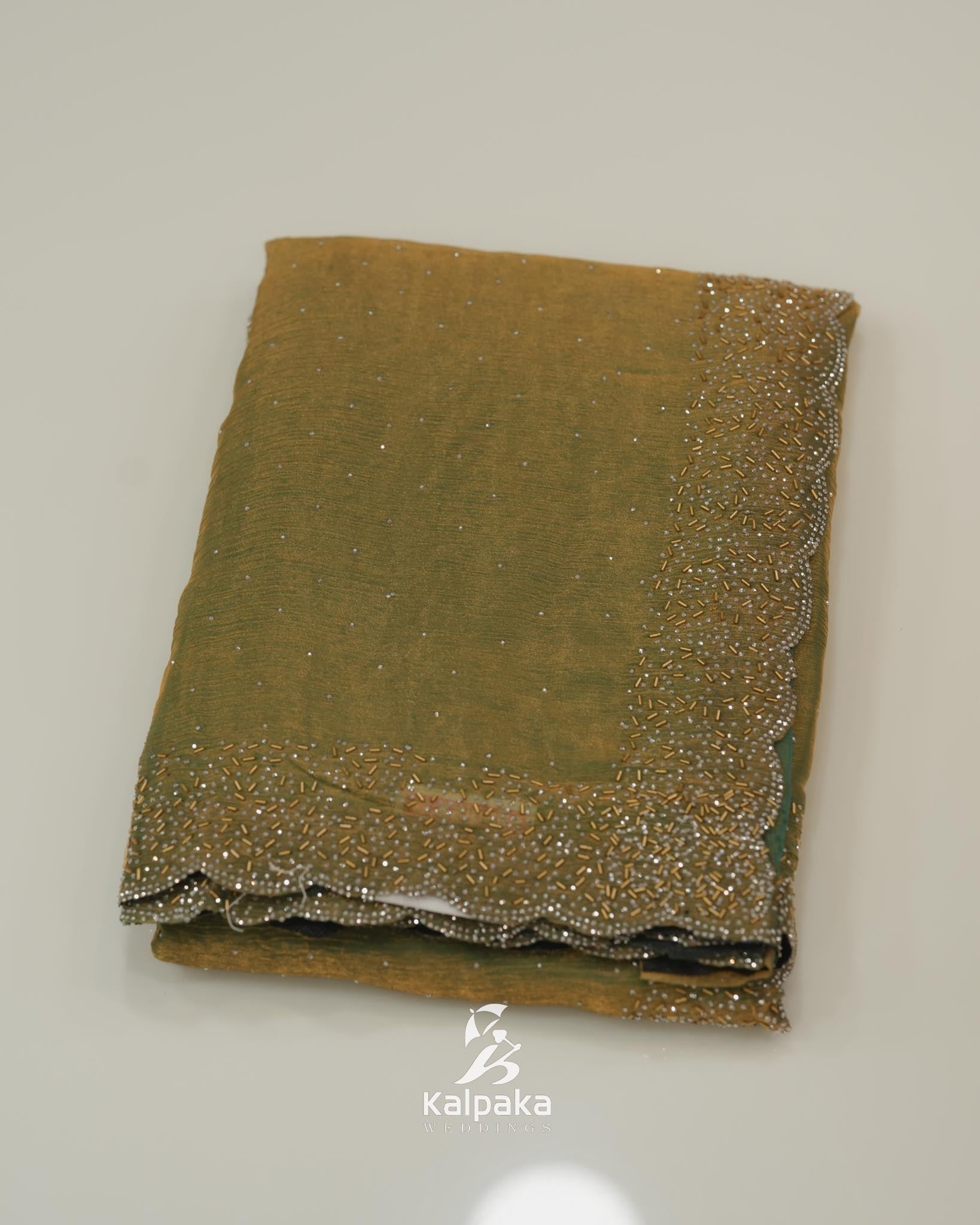 • Design: A standout scalloped border adorned with intricate beadwork in gold and white, adding a touch of sparkle and luxury.